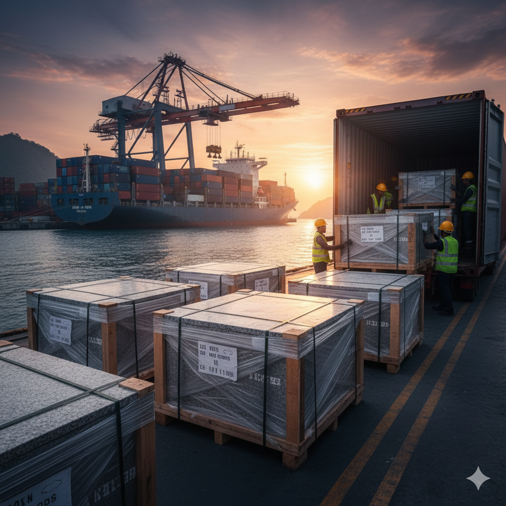 Conectamos el granito indio con el mundo. Cada palet es embalado meticulosamente para el transporte global. Nuestra logística experta garantiza que su pedido llegue a tiempo, donde sea que lo necesite.